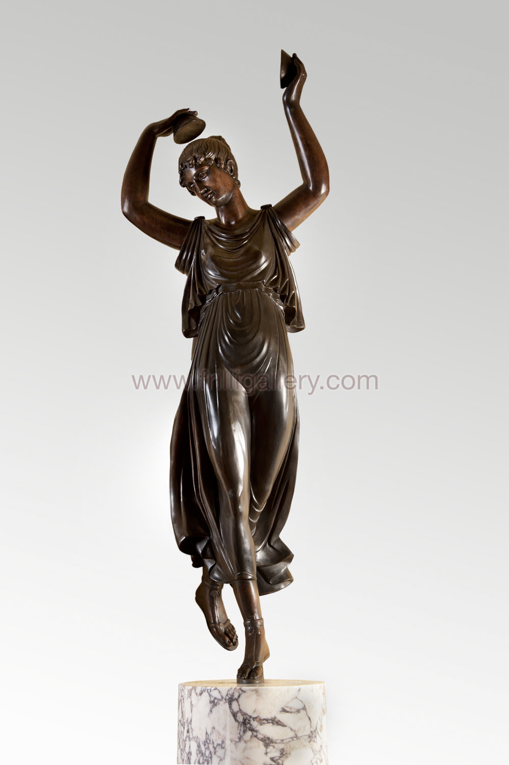 In the work the girl is caught in a dance movement with her arms raised high while clutching the cymbals and her left foot raised backwards.
