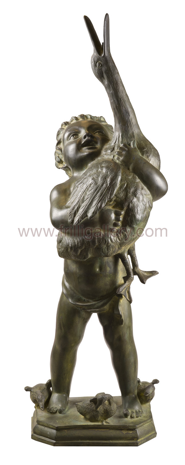 The theme of the cherubs is very dear to the Italian Renaissance. These adorable little children, chubby and naked, are often represented together with animals, their eternal playmates. This ironic and playful child is playing with some ducks. She holds her mother firmly in her arms, while at her feet we can observe her young.