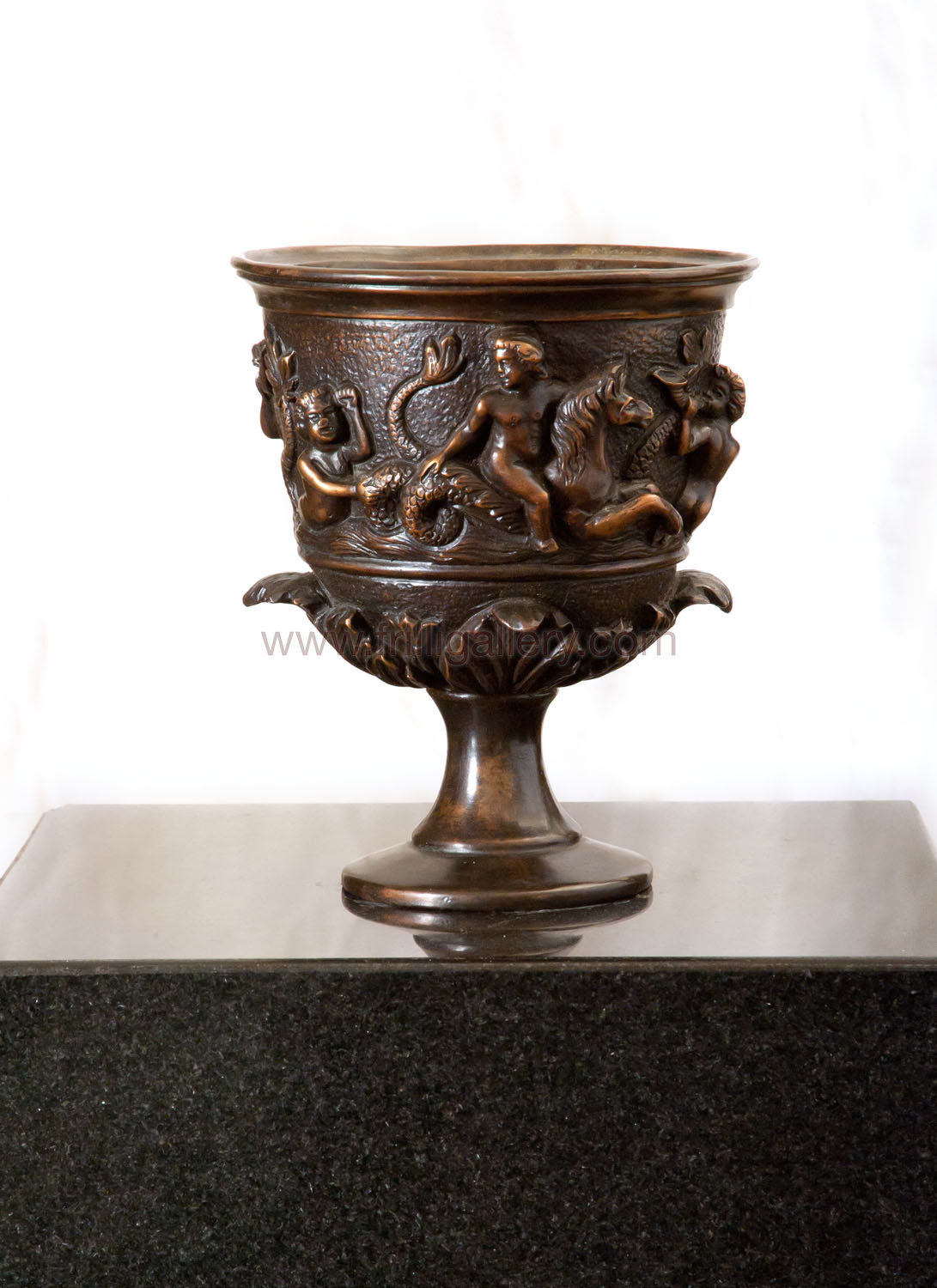 Realizzata in delicato bronzo, questa coppa è caratterizzata da un motivo di matrice mitologica che, nella parte alta, corre lungo tutto il perimetro dell'opera. In esso sono raffigurati elementi marini e naturali, mostri e personaggi del mito. L'elemento naturale ricorre anche nel resto della coppa, attraverso foglie in rilievo.